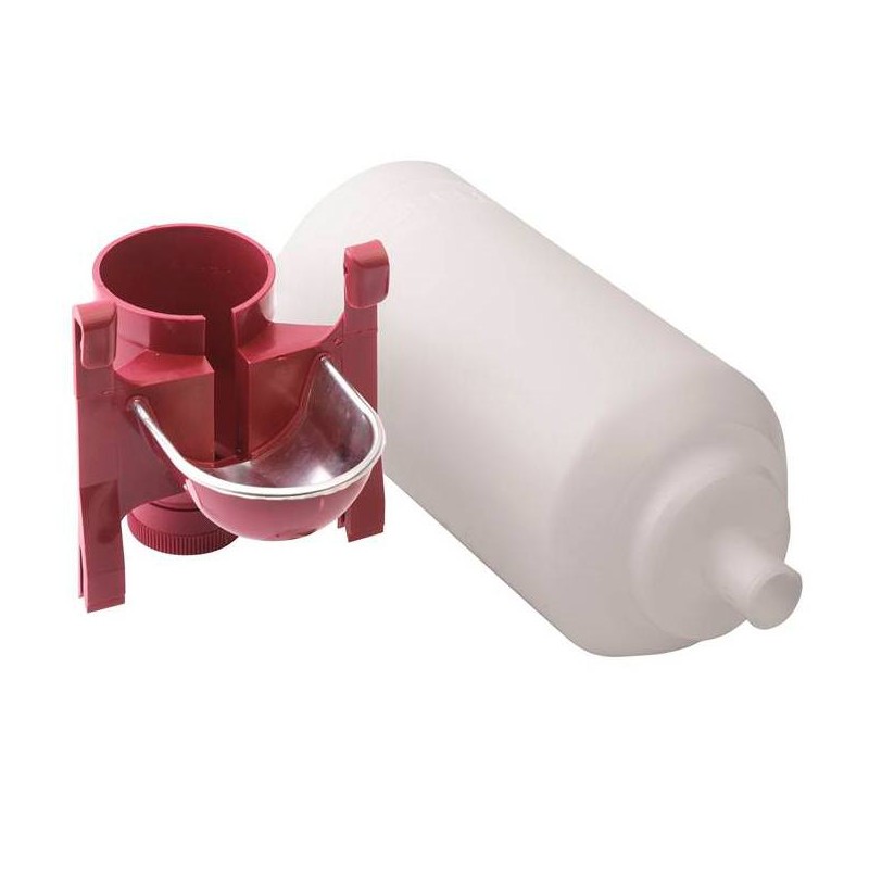 Bebedero automático de plástico para conejos, taza de plástico cubierta con chapa de acero inoxidable, para evitar que puedan morderla o romperla, espita para conexión de goma flexible y pestañas elaboradas en plástico para fijarlo en malla de alambre. Incluye una botella plástica de 2 litros.