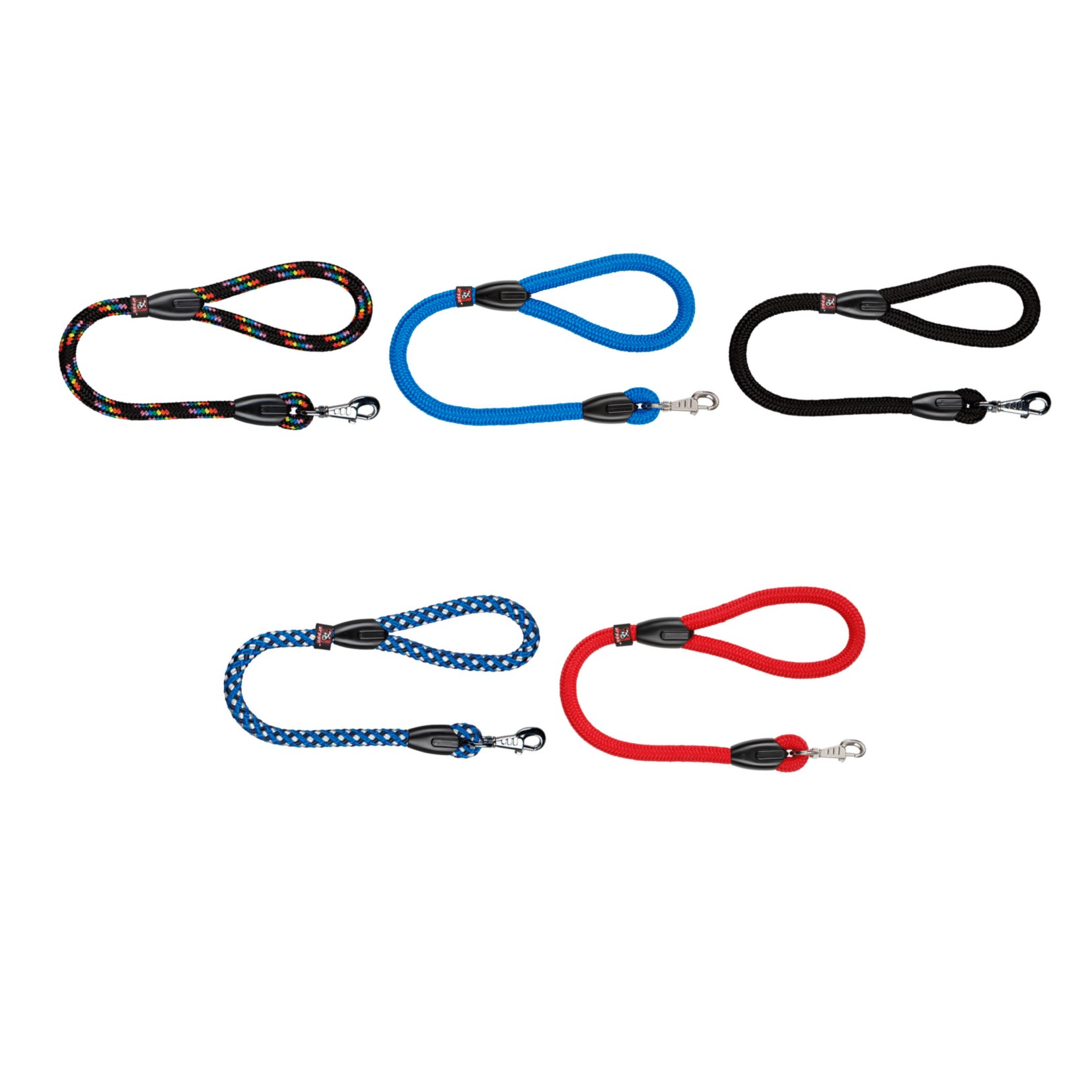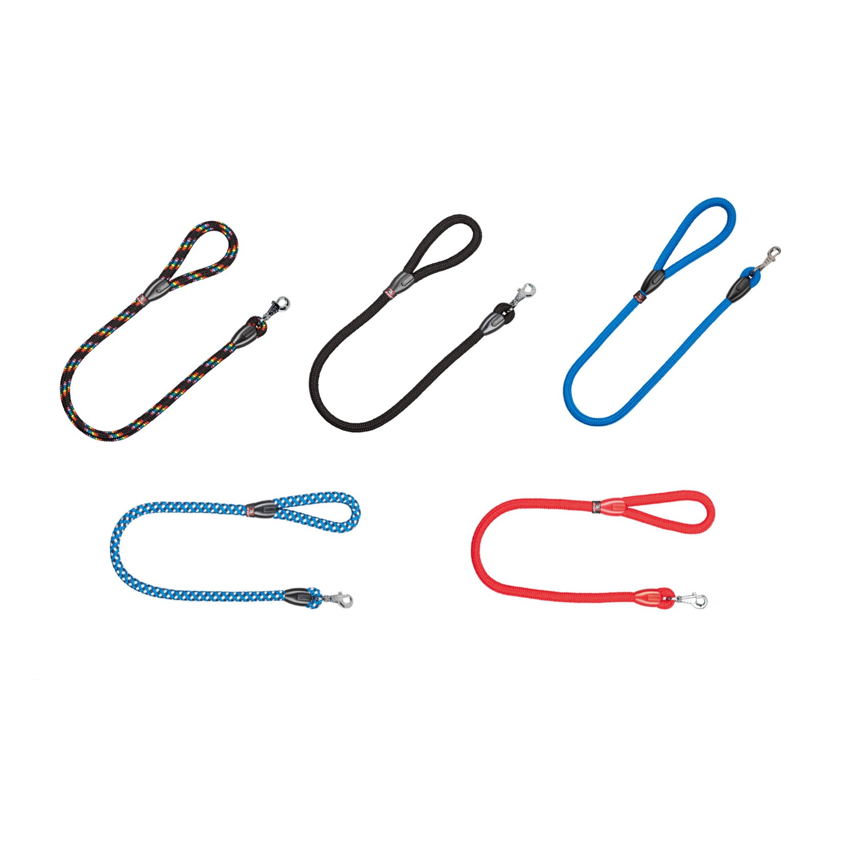Cordón de nylon. Terminaciones de plástico junto al mosquetón y de plástico + caucho antideslizante junto a empuñadura.