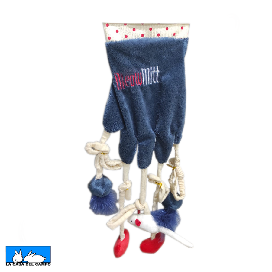 Manopla con distintos elementos de peluche (ratones, pompones con plumas, corazones) para entretener y jugar con nuestros amigos felinos.