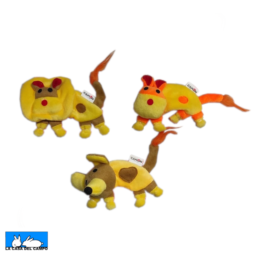 Peluches de 10 cm que emiten un sonido similar a estrujar plástico. Disponible en varias formas: león, conejo, ratón.