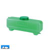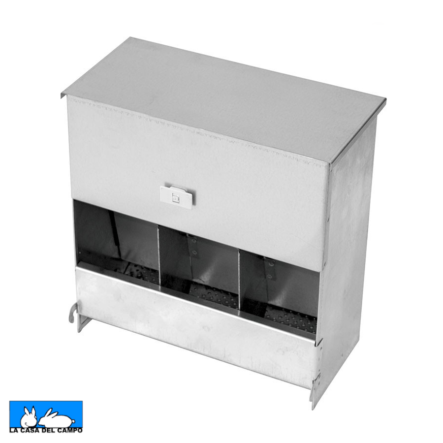 Comedero para conejos fabricado en chapa galvanizada, con diseño de tapa para su instalación en el exterior de la jaula, evitando que otros animales accedan al alimento. Incluye presilla y ganchos para fijarlo de manera segura a la jaula. Además, cuenta con un fondo perforado que permite evacuar el polvo del pienso, previniendo que los conejos lo ingieran.